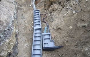 - Spojení jednotlivých dílů kabelové chráničky probíhá nasunutím jednoho žlabu do druhého, kdy ustavení vzájemné polohy zaručují jednoduché zámky na koncích žlabů.
